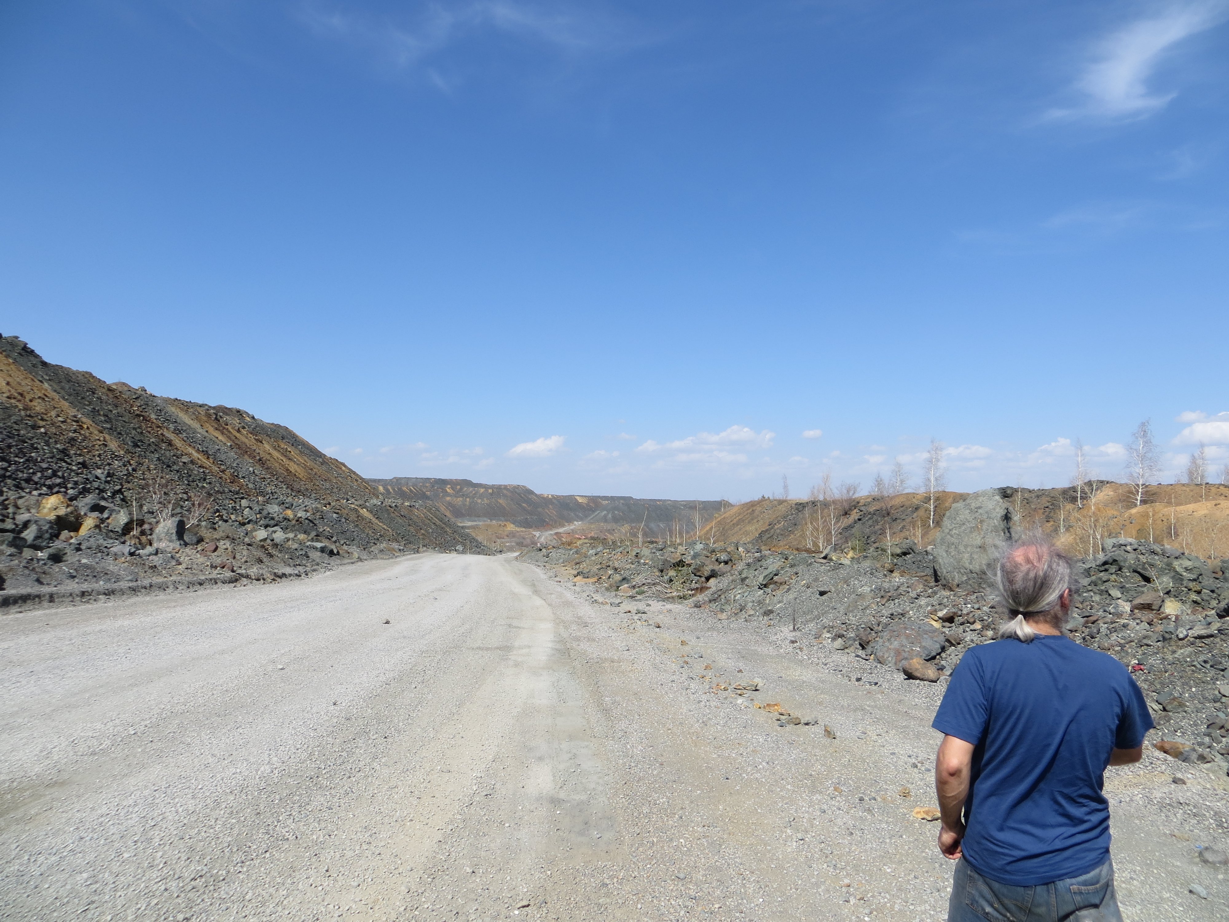 Ну что ж, едем. Объезжаем отвалы, находим ту дорогу, но там опять знак "въезд постороннему транспорту запрещен". Ладно, рискуем. Заворачиваем и вверх. Дорога все поднимается и поднимается. Едешь как в туннеле - среди этих огромных отвалов только кусочек синего неба виден. Оставляем машинку в появившемся кармашке. Идем пешком.