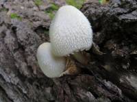 Вольвариелла шелковистая один из самых красивых пластинчатых грибов. Ее белая шляпка покрыта желтоватыми шелковистыми, тонкими волокнами. Увидев этот гриб впервые на стволе мертвого дерева, я несколько минут любовалась необычной пушистой шляпкой.