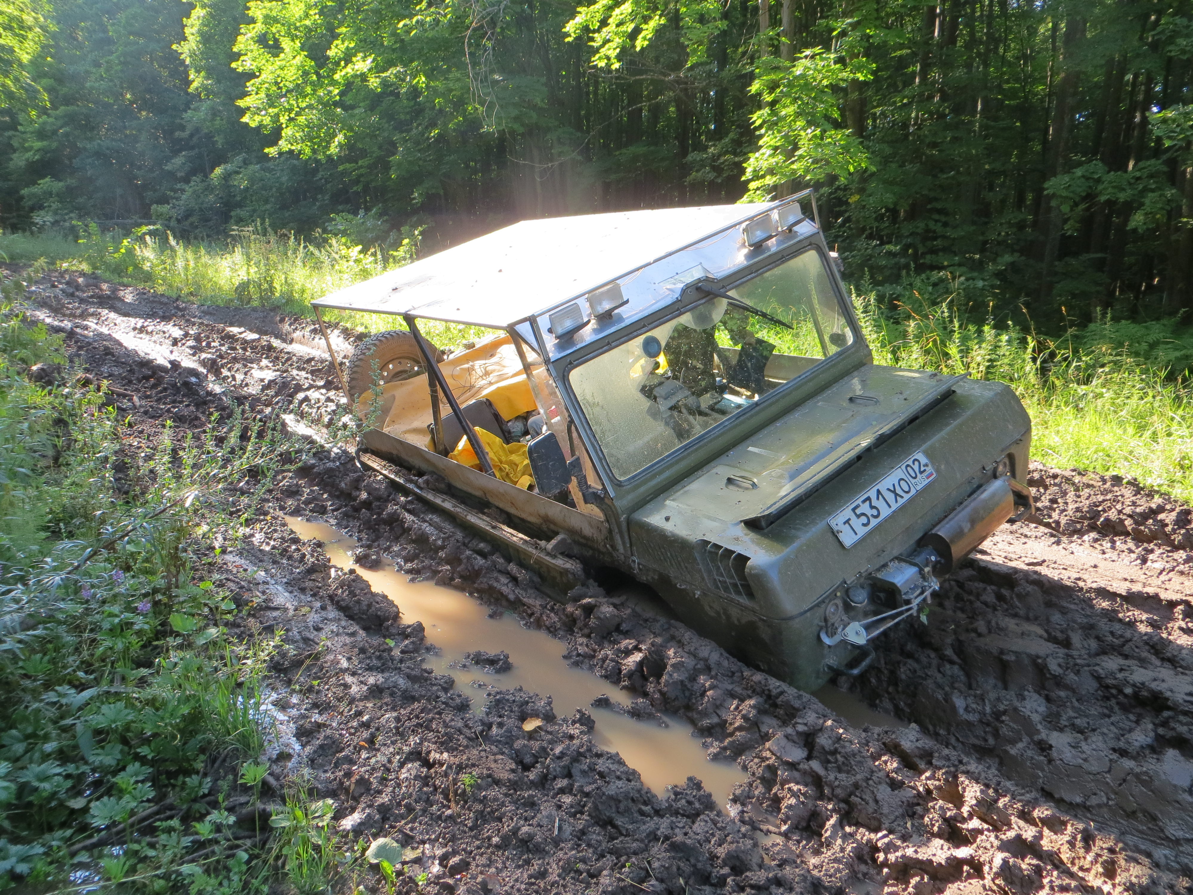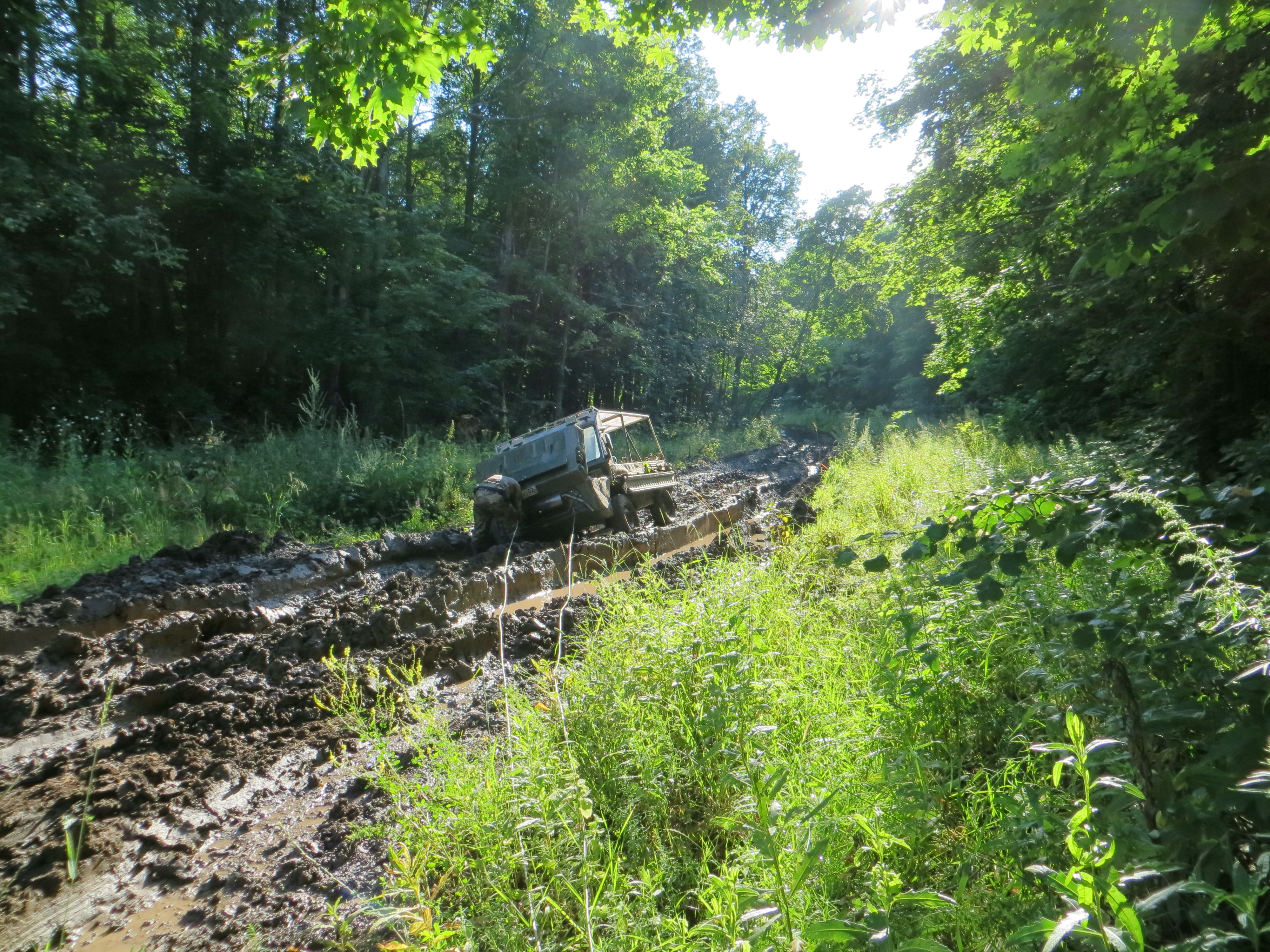 Пришло время пустить лебедку в дело. Вжжж, пониженка, вылезли. И осторожно покатили дальше. О, альтернативная полоса - гусеничный трактор рядом прочистил дорогу. Едем, радуемся. Но... недолго. Кончилось даже такая дорога, на пути гора глины оставлена. Всё! Приехали. Путь дальше закрыт. Либо пилить новую дорогу по лесу - еще километр до поляны, либо обратно возвращаться. Но ведь мы почти приехали! Неужто разворачиваться? Нет, конечно! Выбрали третий альтернативный вариант - оставить машину в лесу (все равно тут никого не бывает), а самим прогуляться.