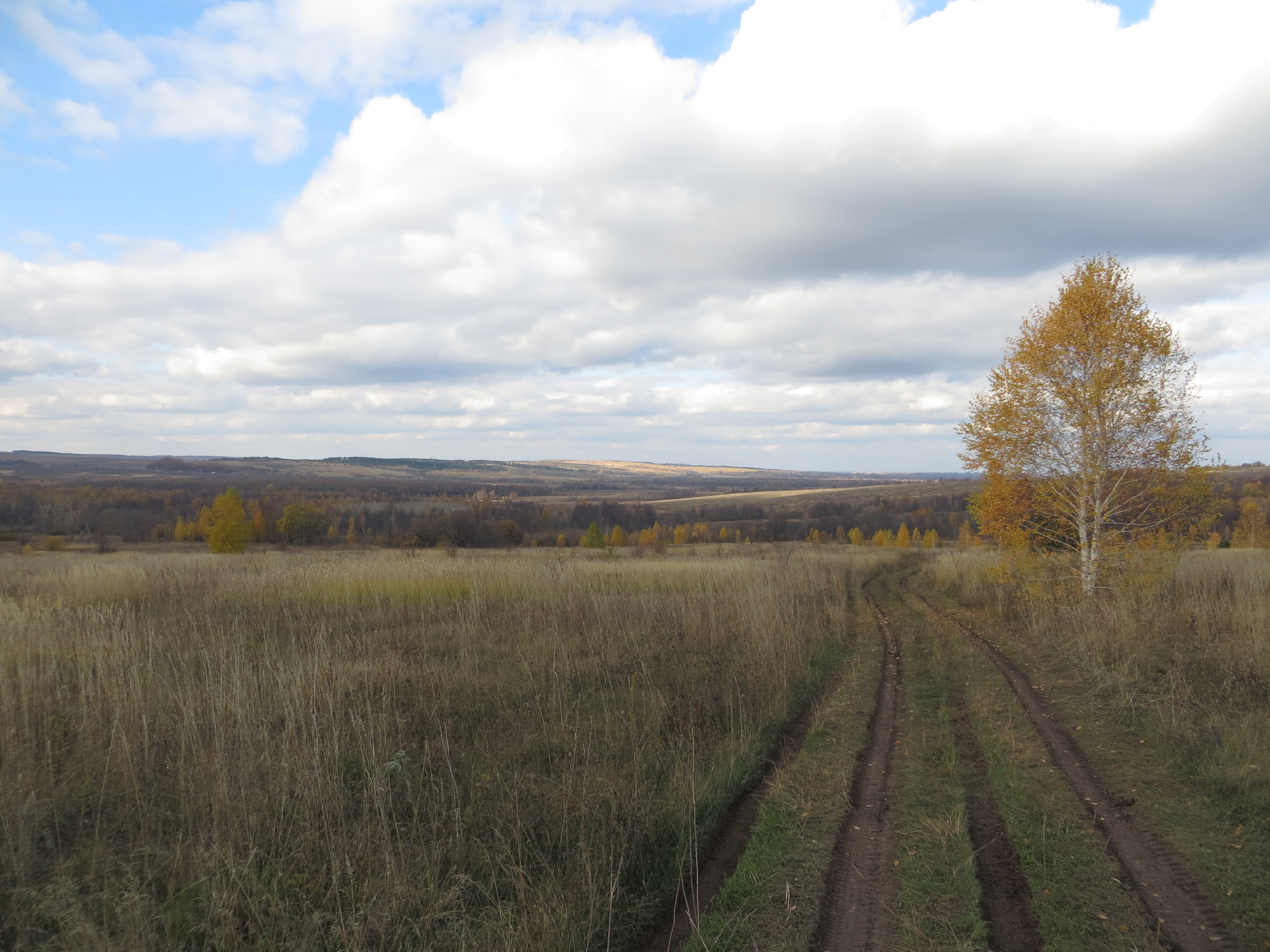 На следующий день у нас другой маршрут - к любимому нашему древнему лесу в окрестностях Уфимки. В отличие от предыдущей недели, дождей на этой недели не было, и мы надеялись, что сегодня доедем до точки на машине. Полевая дорога действительно подсохла, но под травой склизь и мокрость остались, и все низинки были в лужах. Похоже что тут дожди все же были... Но вот гать через ручеек, а там все размешано. Нет, мы туда не полезем на жигуляке. Пришлось развернуться (в процессе малость застряли, но я могучая!), чтобы оставить машинку и идти дальше пешком.
