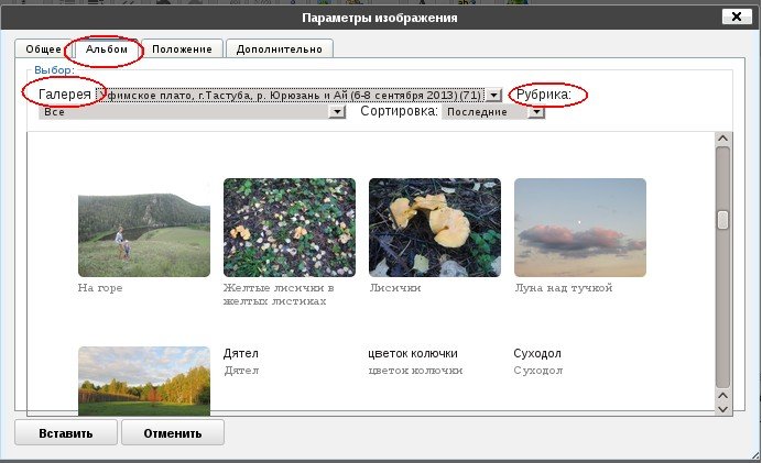 Появляется окно "Параметры изображения", где нажимаете вкладку Альбом и выбираете интересующую вас Галерею и/или Рубрику с нужными вам фотографиями.