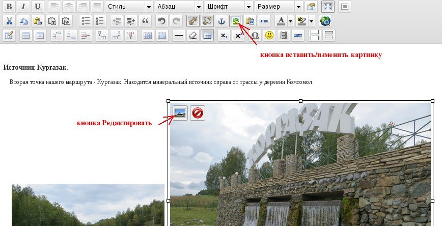 Чтобы загрузить фотографию из Галереи фотоальбома в редактор блога/форума нажимаете кнопку "вставить/изменить картинку"