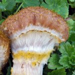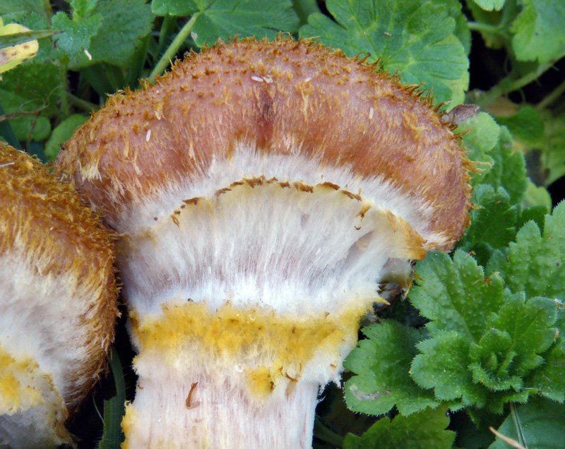 Пластинки молодых грибов светлые, желтоватые. С возрастом они темнеют и покрываются бурыми пятнами. Ножка в верхней части светлая, желтоватая, как и пластинки, в нижней утолщенная, коричневатая, у старых грибов сильно темнеющая, жестка. На ножке белое перепончатое кольцо. Кольцо прочное, шерстистое, часто двойное.