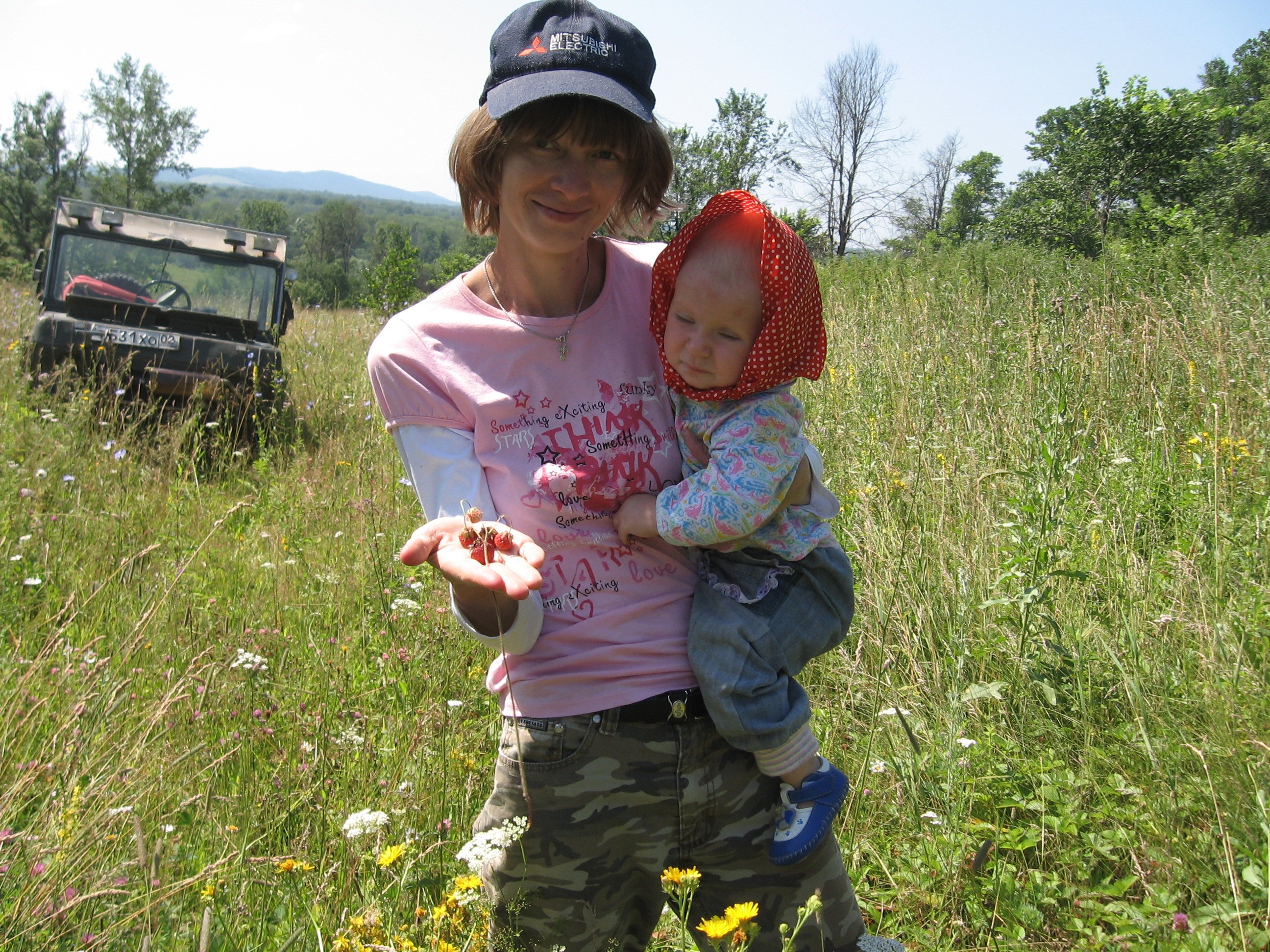 Проснулись мы раненько, торопиться нам некуда. Позавтракали, покупались вдоволь, в маленьком лиманчике окунули и дочку в теплую водицу. И поехали обследовать гору, которую приметили накануне вечером. Гора почти безлесая, сплошные полянки, расположенные на солнечной стороне, и явно там должны расти ягодки. И не прогадали - действительно, ягод было немерено, и все красные и очень крупные.