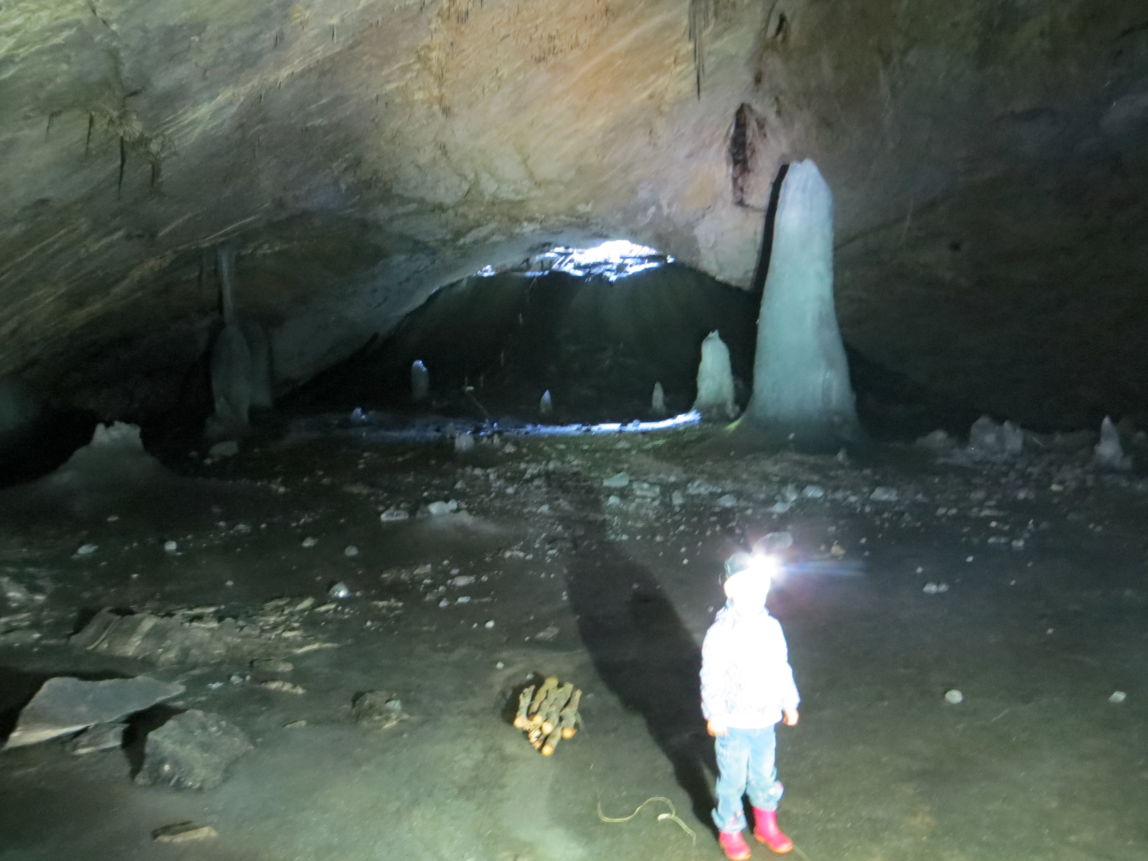 Муж по леднику спустил вязанку будущих ступенек лестницы и следом спустился сам. Все в сборе. Весь пол пещеры покрыт ледником. Довольно скользко, так что детенку держу крепко за руку. Идем, рассматривая ледяные фигуры. Варьке вообще нравится бывать в новых необычных местах, главное - чтоб было что-то интересное вокруг.