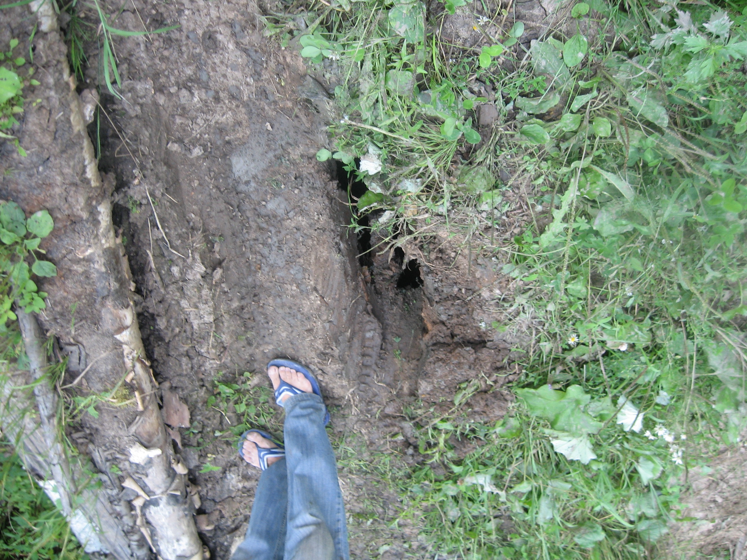 Опять то ли мост, то ли гать. Вообще какая-то гадская: гнилые бревна землей присыпаны, а там внизу глубокий овраг с ручейком. Прошли по гати - вроде держит. Поехали. Бабах - блин, переднее правое колесо провалилось в дыду, а под ним пустота. Не быдло ж тут дырки? - теперь есть