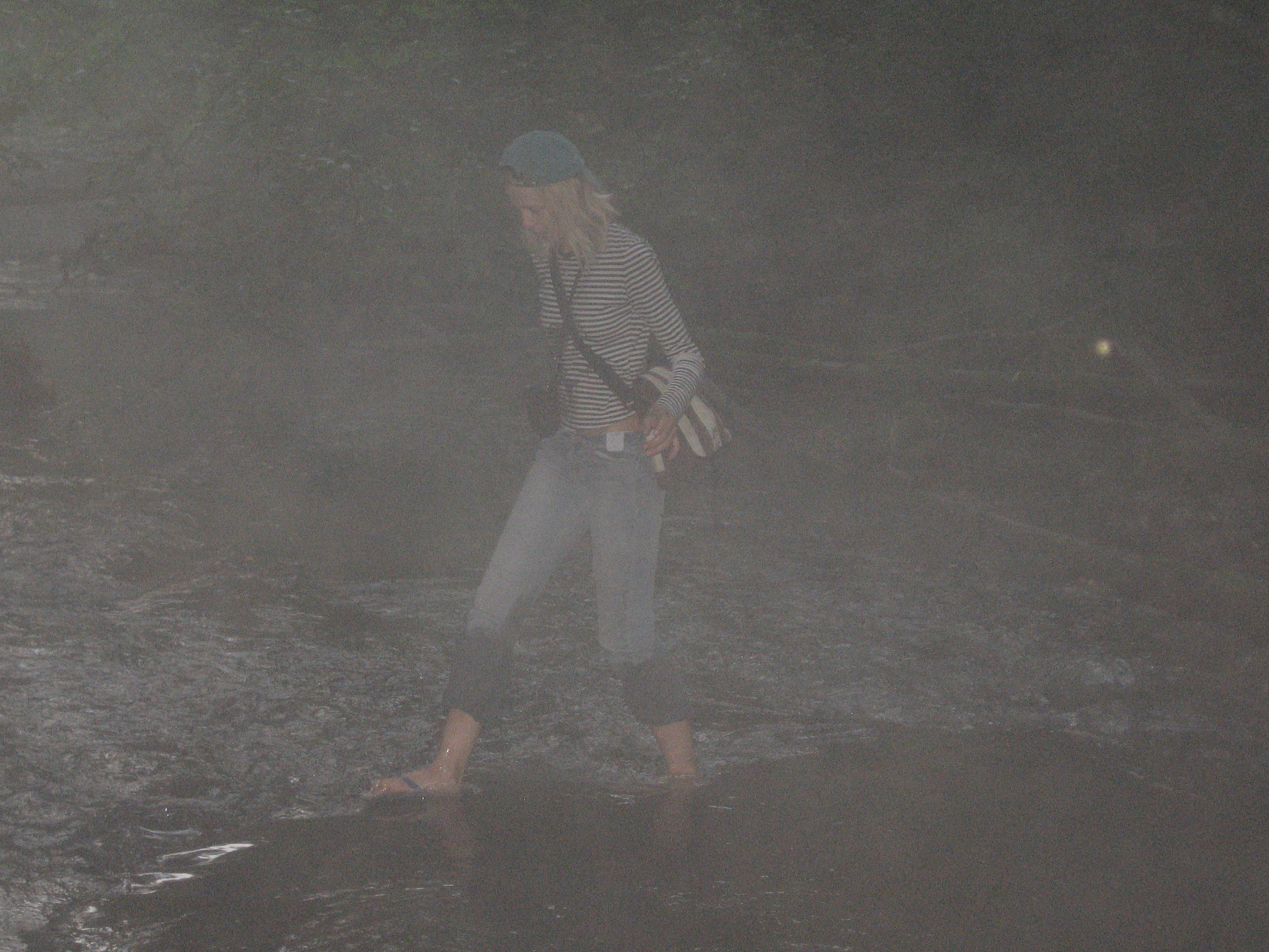 И вот по треку осталось совсем немного до водопада, машину выводим на ближайшую отмель, оставляем ее на берегу под присмотром пеших туристов и идем на шум. После такого экстрим-путешествия прохлада воды успокаивает, и адреналин понемногу проходит. Уже в сумерках добрались к грохоту водопада. Но чтоб увидеть грохот Атыша, к нему нужно еще и добраться. Путь шел по природным мостикам через холоднющую речушку. Первая попытка пройтись по такому мосту увенчалась плюхому в леденящую речку - мостик низенький.