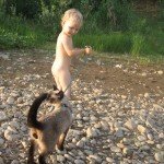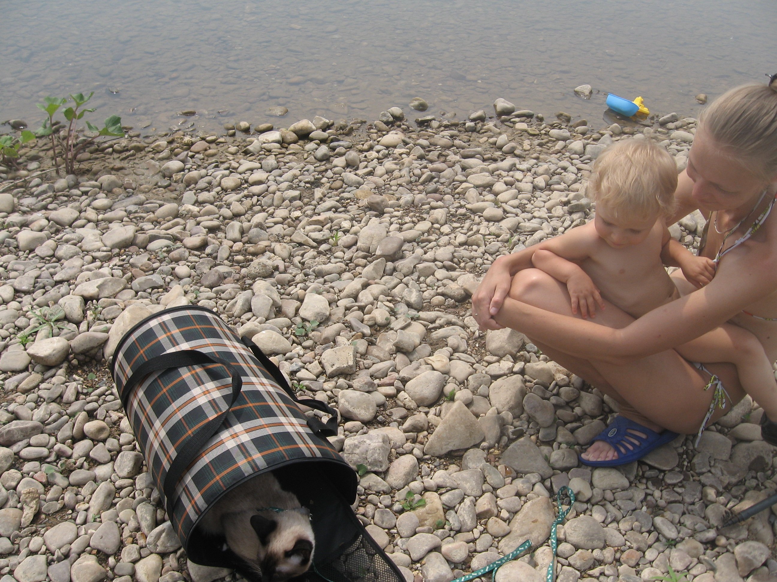 Приехали к Инзеру уже затемно, развели костер и разбили лагерь, поужинав, легли спать. Кота взяли с собой в палатку. Утром, позавтракав, идем на речку - папа несет Котю, я с дочей топаю впереди. На пляже жарко. Дочку помещаем на мелководье плескаться., а кота - в тенек прибрежной заросли. С котом остаемся по очереди - то муж, то я, а чтоб Котику не было жарко, шкурку его обливаем водичкой.