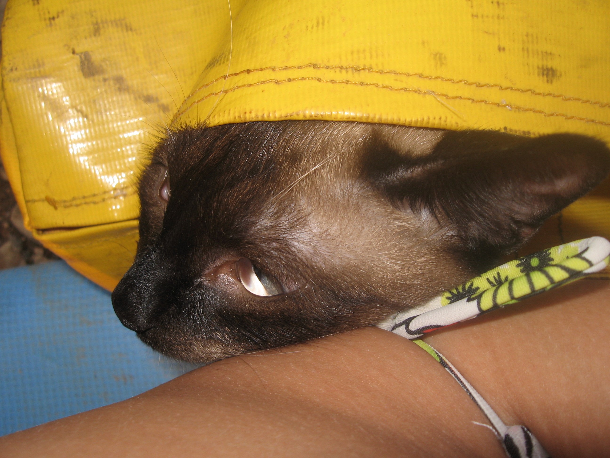 Однажды зимним ранним утром, на ничего неподозревающего и еще спящего котенка была осторожно надета шлейка. Почему спящего? Так это самый безопасный способ для кота и для тебя. Во-первых, ты ненасильно натягиваешь на кота шлейку, при этом он всеми силами пытается вырваться и высвободиться от оков, а спокойно одеваешь на расслабленного кота, слегка его поглаживая. Во-вторых, проснувшийся кот не подозревает о случившемся, ну подумаешь, ходить неудобно, может что отлежал. Снимаешь шлейку тогда, когда котик уснет. Так процесс повторяется изо дня в день, пока кот не привыкает к шлейке до такой степени, что может ходить-играть-спать-есть ее не замечая. Теперь можно шлейку на котика одевать в любой момент.