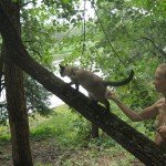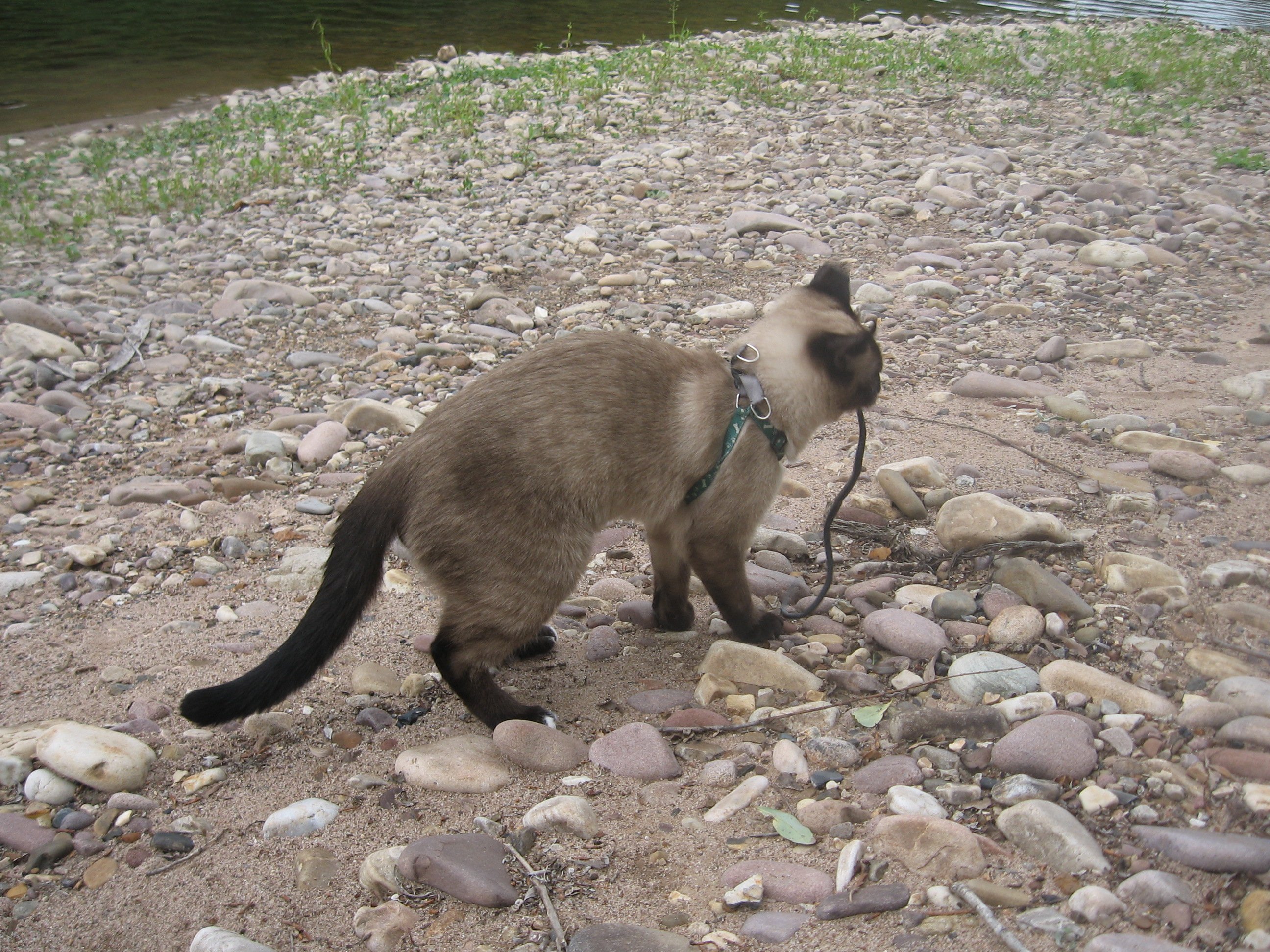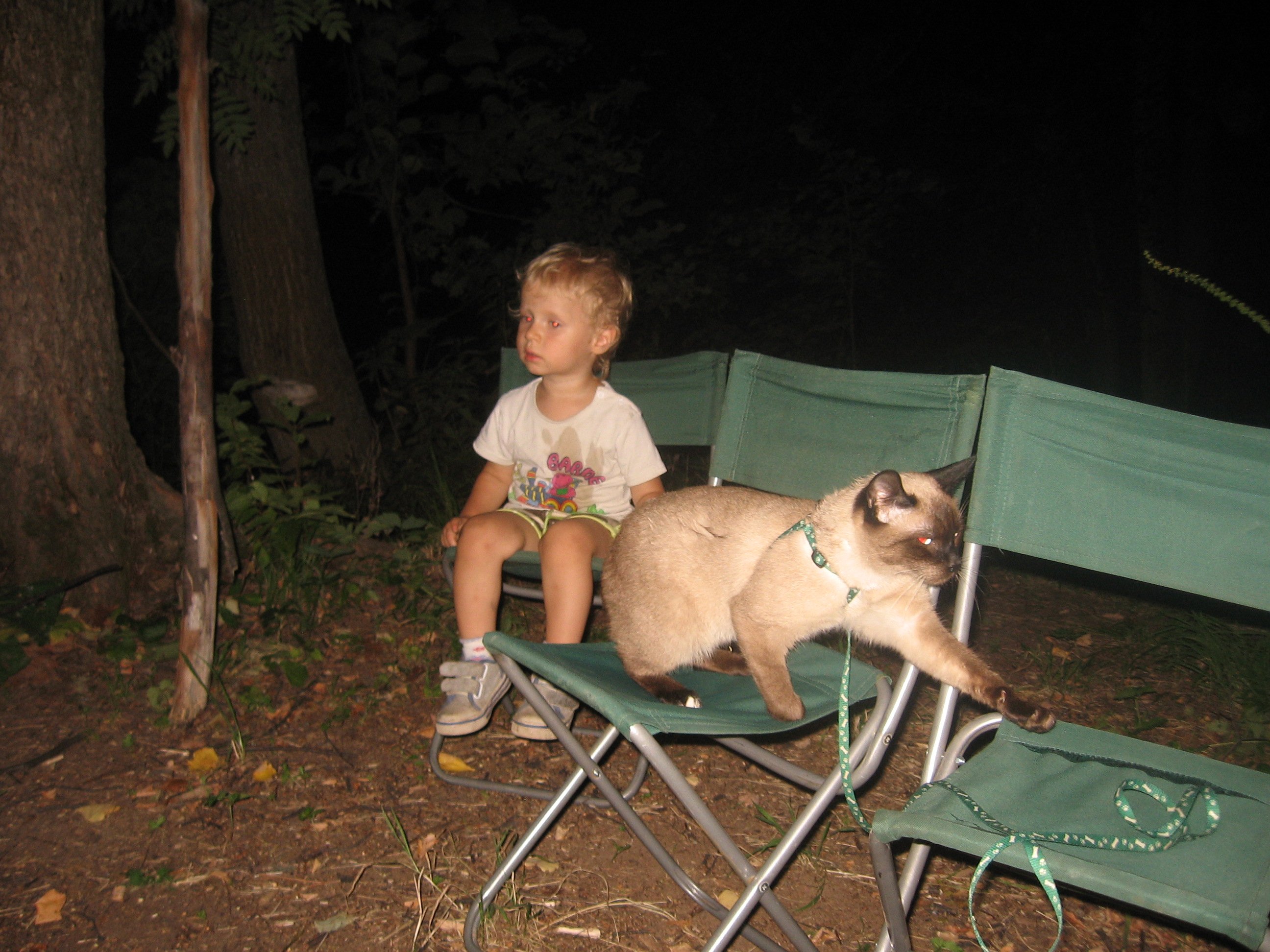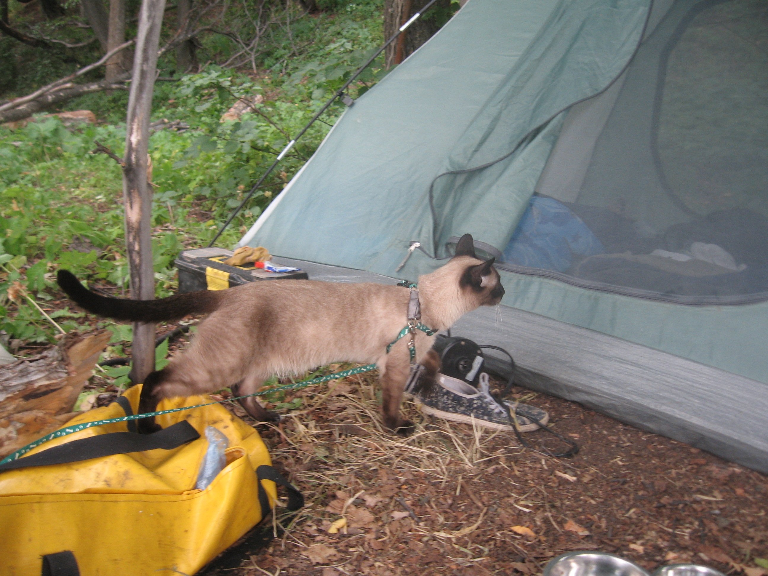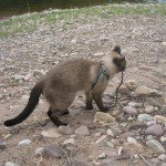 Становилось более жарко и мы все пошли в лагерь, там хоть тень деревьев как-то спасала от жгучего солнца. Кот пытался исследовать новую территорию и начинал уходить дальше лагеря, приходилось его отлавливать, и гулять вместе с ним на поводке, ведь в лесу, судя по следам у реки, водились хищные звери.