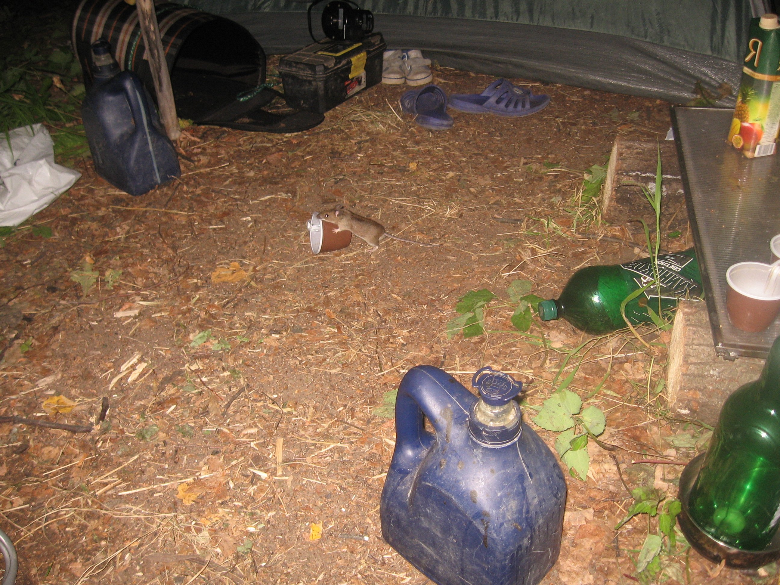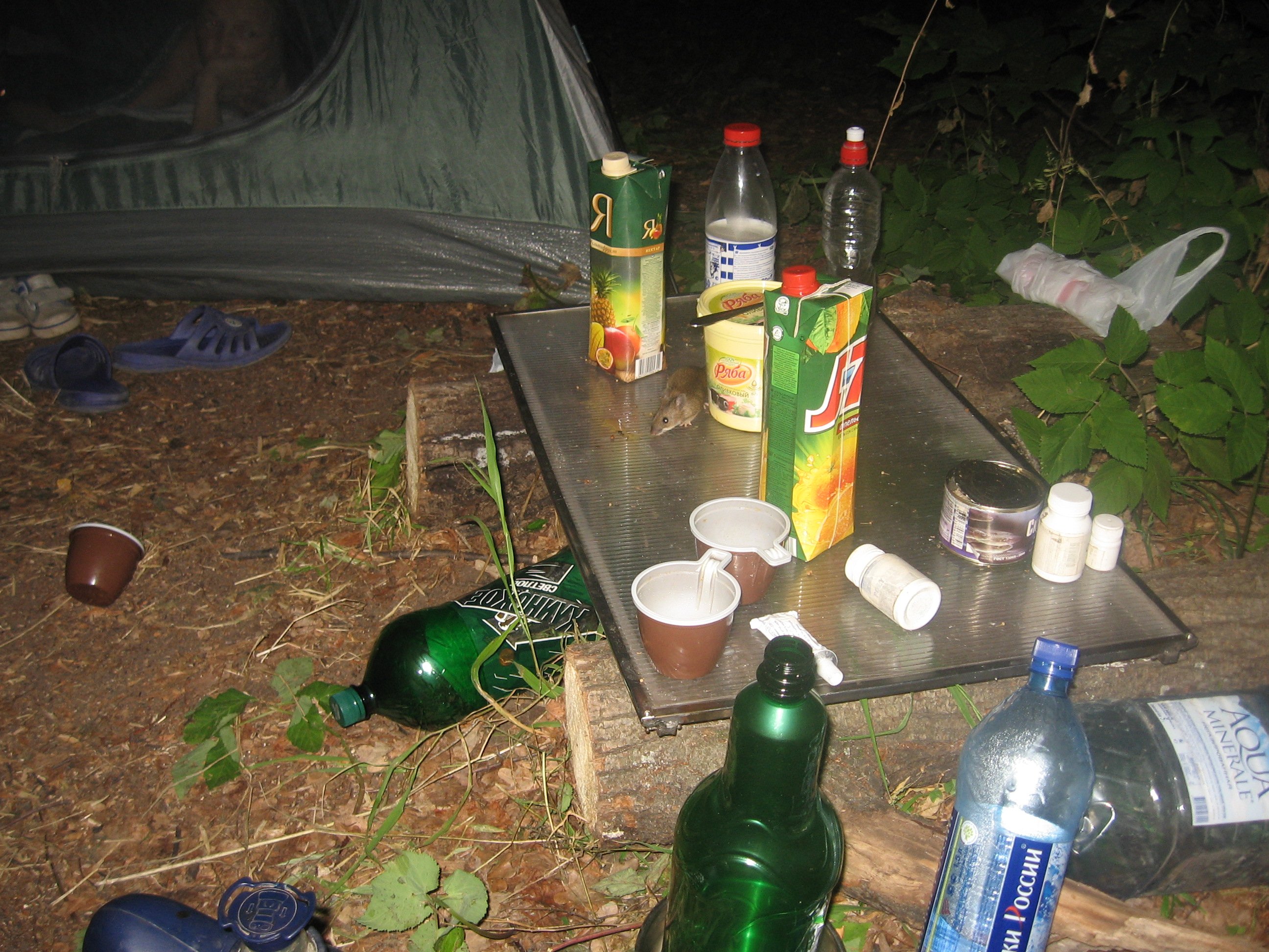 Кот от такого переполоха носился по палатке, не обращая внимания, что под его лапами спят живые люди. От воплей и топота мышей за стенами палатки и скакания кота по нашим тушкам, нам не суждено было досматривать сладкие сны. Пришлось мужу вставать и пытаться утихомирить серую массу, а мне охранять кота в палатке и наблюдать. Мужем из подручных материалов (пластиковых бутылок, тарелок и сухой вермишели) были сооружены несколько мышеловок, и мы стали ждать.