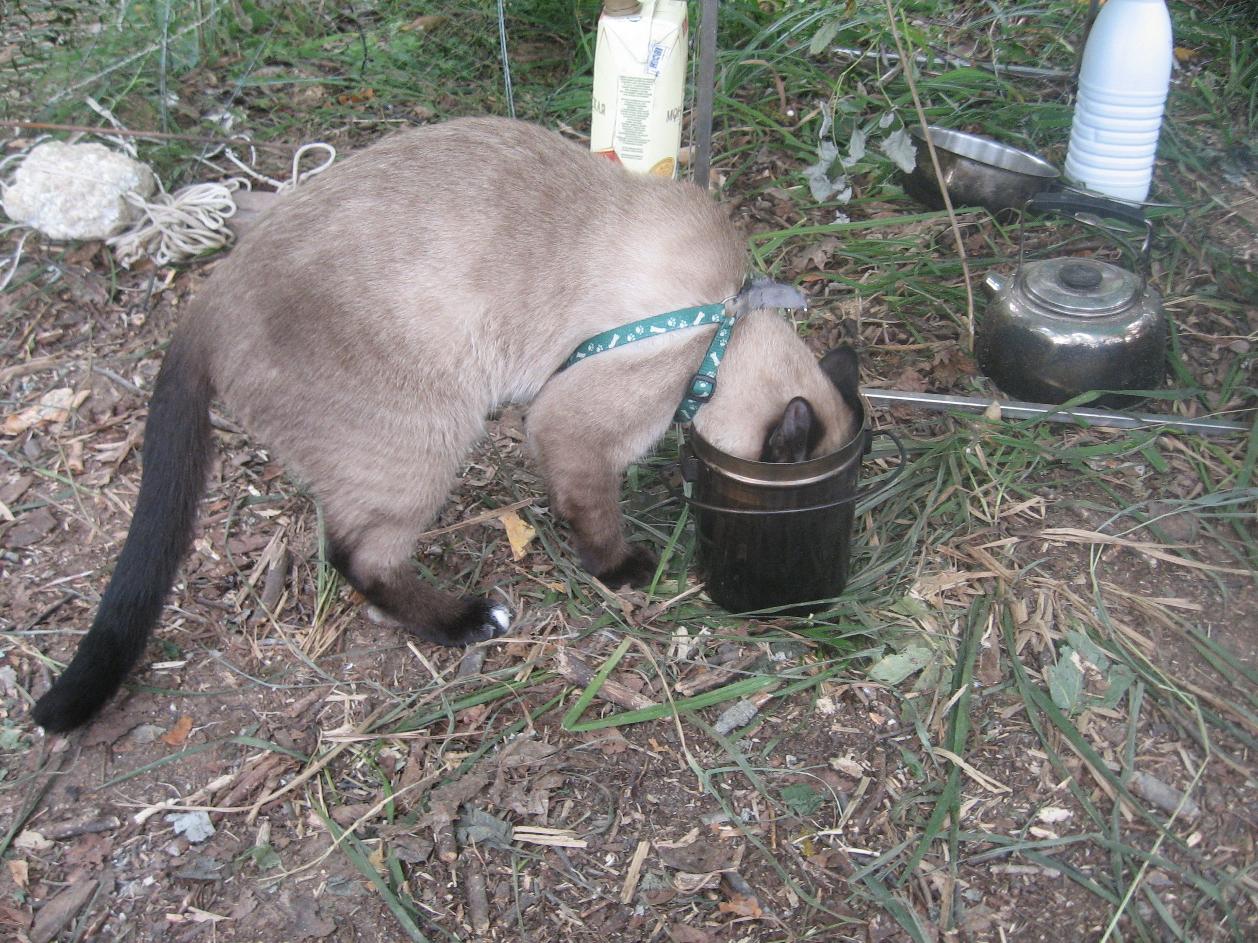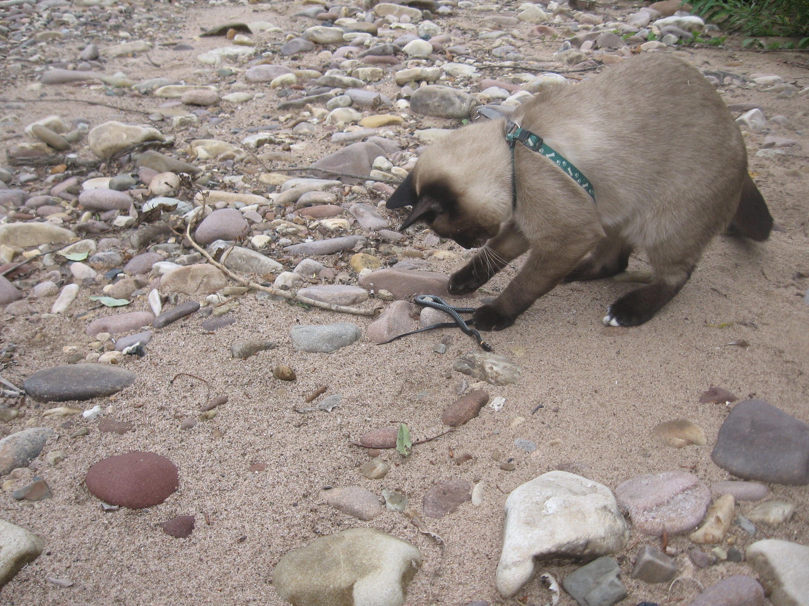 Мохнатый знакомится с окружающим миром, пытаясь заползти поглубже в заросли, но длина шлейки ему этого не позволяет, приходится брать его на руки и относить поближе к себе. Муж поймал ужика и положил возле лапок кота. У того была реакция молниеностная, прижав голову ужику, схватил его за шею (или что там у них ниже головы) и понес в кусты. Кровь предков, однако! Ведь сиамские кошки у себя на родине - в Сиаме (ныне Тайланд) отлично справлялись с некрупными кобрами, убивая их с необыкновенной скоростью.