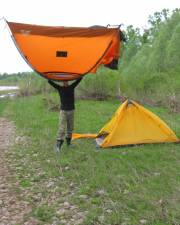 В летние жаркие дни, как вариант, над внутренней палаткой можно натянуть навес, который спасет от солнца днем и от росы и небольшого дождика ночью, а в палатке будет свежо и сухо.