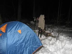 Один из примеров установки палатки в лесу, между двумя деревьями, к которым привязывается растяжка, поддерживающая двускатную крышу. Такая установка позволяет обойтись без вертикальных опор.