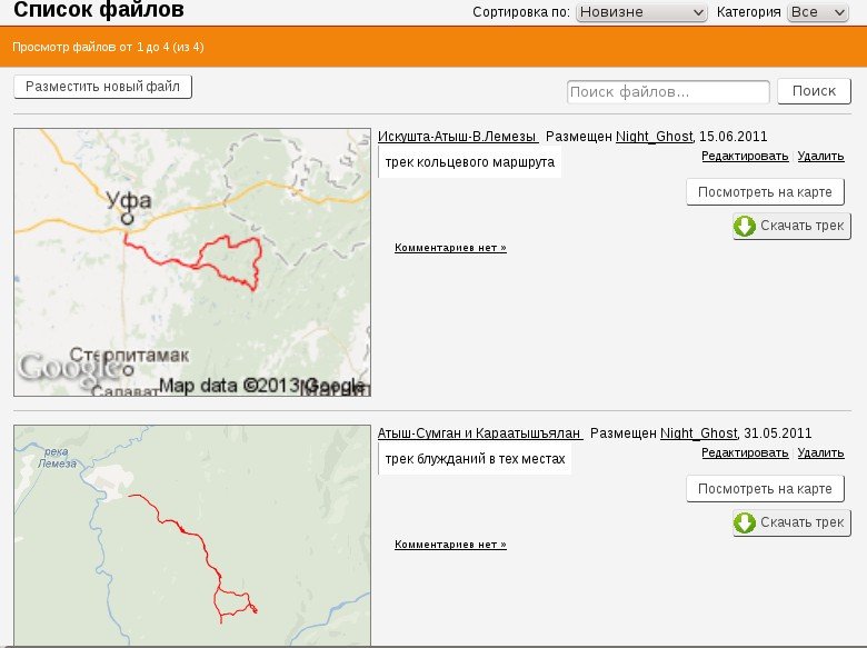 Теперь пора пояснить, как же и откуда треки попадают на карту. Тут все еще проще: в каждой группе, месте и событии можно выложить файлы разных категорий. Так вот если у файла указаны категории "трек", "маршрут" и тому подобное, то этот файл и будет обработан как трек - система сделает ему картинку предпросмотра на карте, а также добавит в общую базу треков.