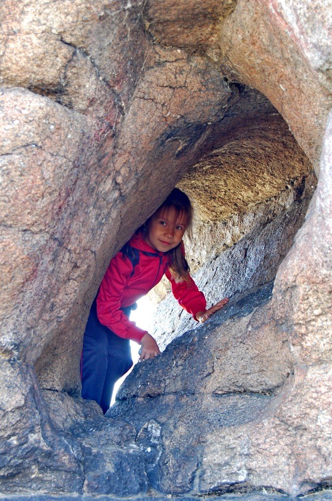 Дочька на пляже, вдали виднеются Каменные палатки.