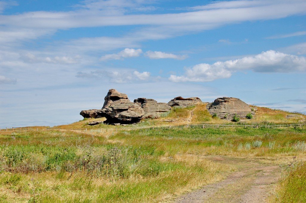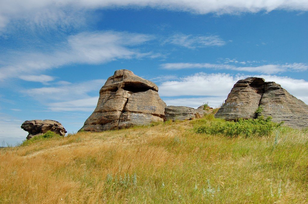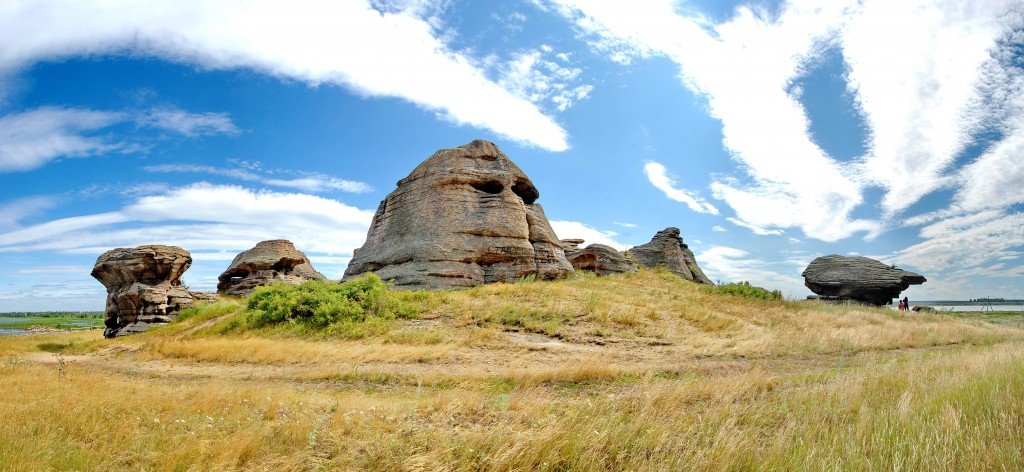 Всего в состав Каменных палаток входит 14 скал, стоящих на небольшой возвышенности. Форма скал разнообразная. Одна из скал напоминает лицо человека, ну или шлем рыцаря.